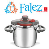 زودپز «falez» (فالز) مدل PROFI COOK دارای سیستم قفل ایمنی است تا هنگام تشکیل بخار داخل زودپز، مانع بازشدن درپوش آن شود. سوپاپی روی درپوش تعبیه شده است تا فشار اضافهی داخل زودپز را تخلیه کند. این محصول پخت سبزیجات، سوپ، موادغذایی کنسروشده و غذاهای گوشتی را در زمان کوتاهی برای شما امکانپذیر میکند. بدنهی این زودپز تماماستیل ضدزنگ است که آشپزی با آن را لذتبخش میکند و علاوهبر مقاومت بالا، موجب تمیزشدن آسان آن نیز میشود. این مدل زودپز فالز دارای طراحی آسانبازشوست که بهراحتی با یک دست و بدون صرف ذرهای انرژی و بدون نیاز به کمک و تنها با فشار دادن دسته روبه جلو میتوان آن را باز و بسته کرد.این محصول دارای یک دیگ با گنجایش 6 لیتر میباشد. این محصول را میتوانید با خیال راحت بدون درپوش، داخل ماشین ظرفشویی بشویید. این زودپز بدنه ای از جنس استیل و دسته هایی از جنس سیلیکون است. کفی کپسولی زودپز موجب می شود که انتقال حرارت به صورت یکنواخت در تمامی سطح ظرف انجام شود. زودپز تمام اتوماتیک است و دارای سوپاپ اطمینان می باشد. درب کلیپسی زودپز موجب می شود که تنها با فشار یک دکمه درب به راحتی باز شود.
