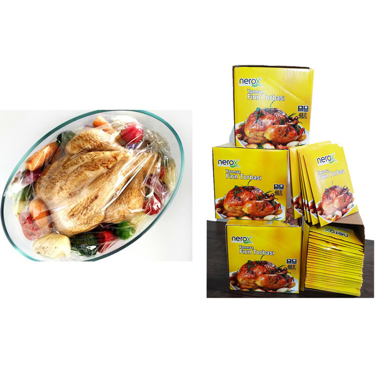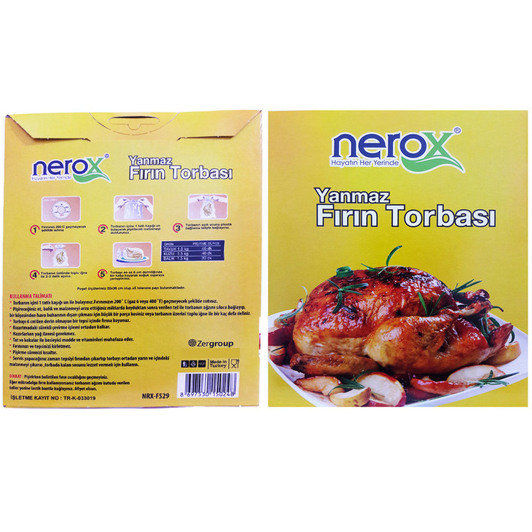 کیسه مخصوص پخت مرغ، ماهی و گوشت، مارک نروکس، ساخت ترکیه، کالایی اصل که استانداردهای غذایی و بهداشتی اروپایی را داراست. اندازه 1×38×25 سانتیمتر و گیره به تعداد مورد نیاز موجود است که به راحتی و آسانی قابل استفاده در فر و مایکروویو می باشد . استفاده از این نوع پخت ( تنوری ) نتایج عالی به ارمغان آورده و در غذاهای پخت شده ویتامین ها و مواد معدنی موجود در غذا از بین نمی رود و طعم مطبوع غذا افزایش می یابد . از مزایای این محصول می توان به محافظت در برابر اشعه مایکروفر ، تمیز ماندن محفظه پخت فر ، حفظ طعم اصلی غذا و ویتامین های موجود بدون سوختگی غذا در حرارت غیر مستقیم ۲۰۰ درجه سانتی گراد و پخت غذا بدون نیاز به روغن ( قابل توجه افرادی که روغن برای آنها مضر است ) اشاره کرد. مناسب استفاده برای گوشت ، مرغ ، گوسفند ، گوساله و ماهی می باشد. جدیدترین محصول ساخت نروکس ترکیه ، بسته 400 تایی بدون مواد بی پی ای و فاقد مواد مضر سلامتی انسان.