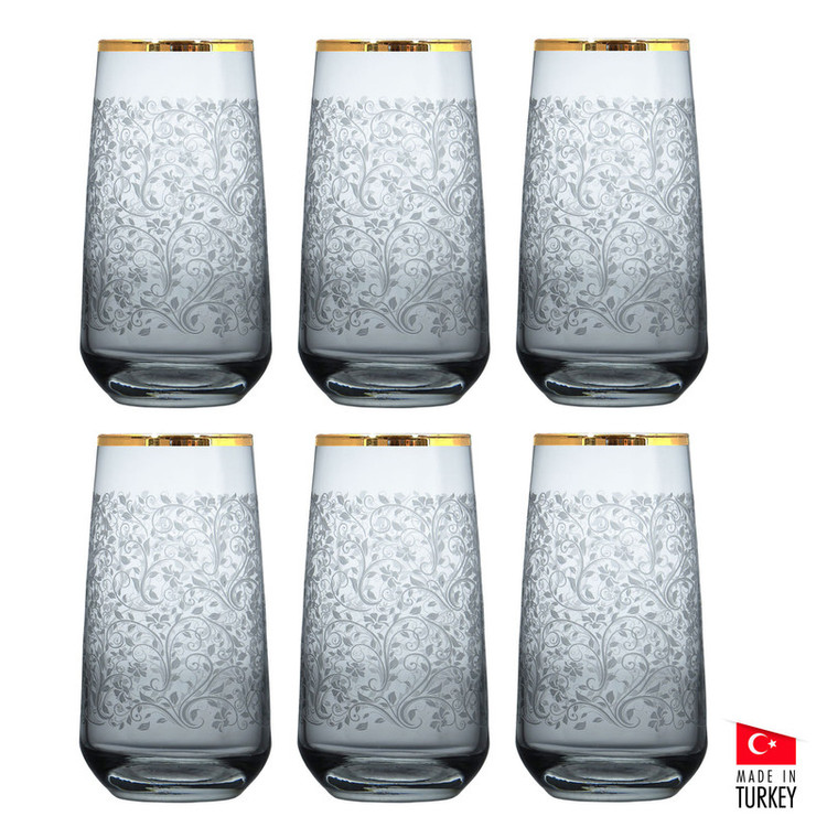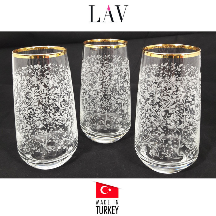 جدیدترین مجموعه لیوان 6 پارچه لاو LAV دست ساز ( Hand Made )مدل LAL2024 محصول کشور ترکیه با دیزاینی آنتیک، فوق العاده و در عین حال کاربردی و با کیفیت است که با داشتن ظاهری جذاب و شیک با لبه طلاکوب و طرح گل و ساقه برجسته روی محصول جهت سرو نوشیدنی های شما در مراسم و مهمانی ها انتخابی مناسب خواهد بود. این لیوان ها دارای بدنه با طراحی بلند و کشیده بوده که جلوه ای زیبا به مجموعه بخشیده اند. این محصول با داشتن گنجایش بالا حجم خوبی از نوشیدنی ها را در خود جای می دهد و همچنین بدنه مستحکم و کفه توپر و سنگین لیوان ها موجب شده تا از پایداری و ثبات بیشتری برخوردار باشند و با اطمینان بتوان از آن ها استفاده نمود.این مجموعه لیوان آنتیک با لبه طلاکوب و طرح گل و ساقه برجسته روی محصول، محصولی شیک و لاکچری می باشد.
