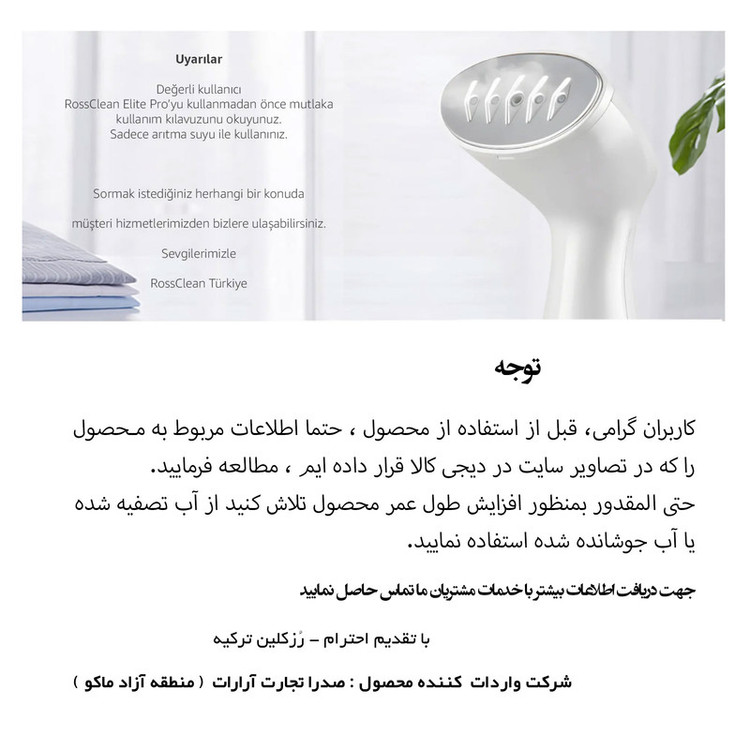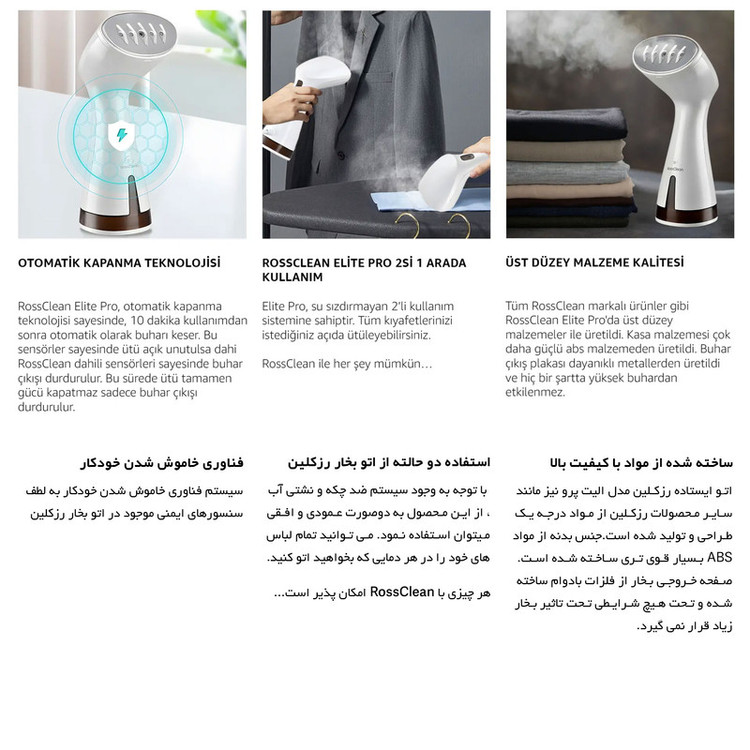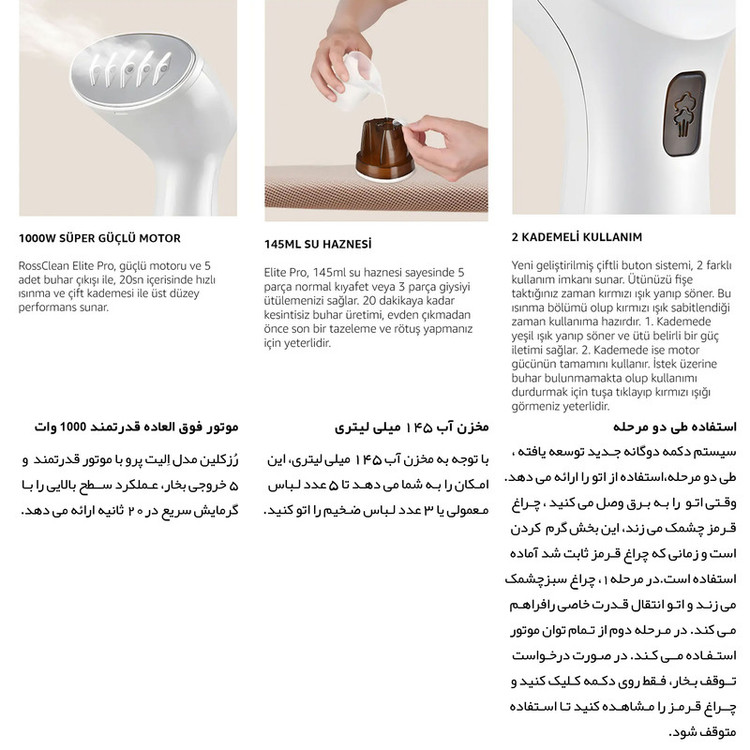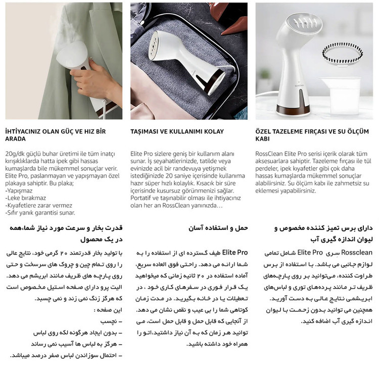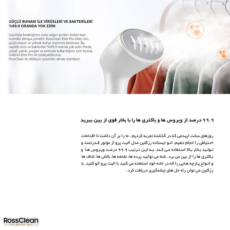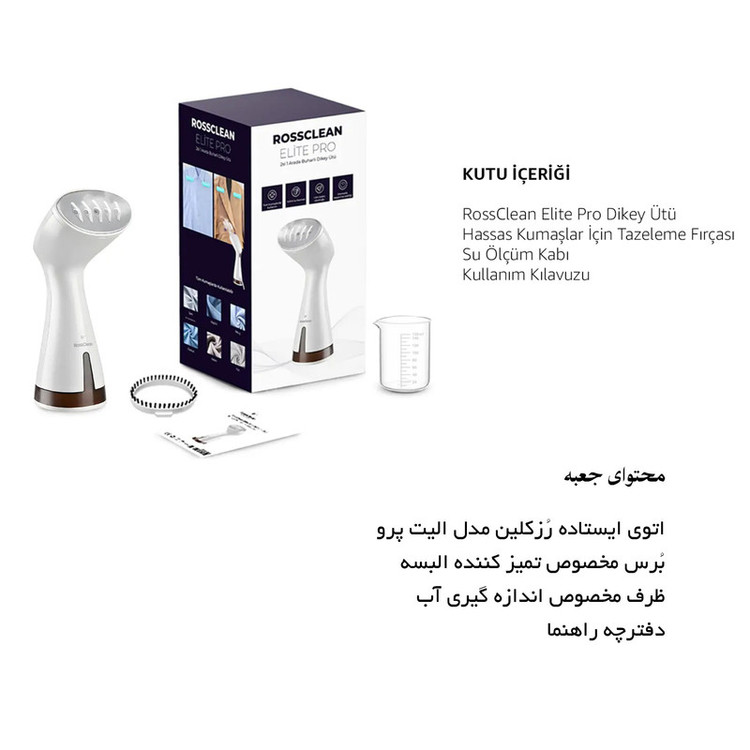 جدیدترین اتوبخار رُزکلین مدل الیت پرو ، اتو بخار پر قدرت سبک و پرکاربردی که در عرض چند ثانیه فقط با بخار آب چروک های لباس، پرده یا هر آن چه که مد نظر شماست رو ناپدید میکنه، بدون آسیب رساندن و ساییدن لباس. مناسب برای انواع لباس ها و پارچه ها. این اتو بخار مخزن 145 میلی لیتری جدا شدنی داره که تا 20 دقیقه بصورت یکسره بخار با توان بالا میده که هنگام اتو کشیدن میتونید جداش کنید و از آب پرش کنید و ادامه بدین! طراحی کوچک و جمع جوری داره که راحت میتونید توی چمدون بزارید. با داشتن یک عدد اتو بخار الیت پرو دیگر نیازی به اتوهای قدیمی رومیزی ندارید، چون این محصول با سیستم ضد چکه خود در دوحالت عمودی و افقی جوابگو هستش... در کل محصولات رُزکلین همیشه برای نتایج فوق العاده سریع طراحی شده هستند... با تولید بخار قدرتمند 20 گرم در دقیقه واقعی ، نتایج عالی برای تمام چین و چروک های سرسخت و حتی روی پارچه های ظریف مانند ابریشم قابل استفاده می باشد. RossClean Elite Pro با موتور قدرتمند و 5 خروجی بخار، گرمایش سریع در 20 ثانیه و دو مرحله عملکرد سطح بالایی را ارائه می دهد. الیت پرو به شما امکان می دهد 5 تکه لباس معمولی یا 3 تکه لباس ضخیم را به لطف مخزن آب 145 میلی لیتری خود اتو کنید. حداکثر 20 دقیقه تولید بخار بدون وقفه برای تازه کردن و لمس نهایی قبل از خروج از خانه کافی است. الیت پرو دارای یک سیستم استفاده دوگانه ضد آب است. شما می توانید تمام لباس های آویزان یا پهن خود را در هر زاویه ای که می خواهید، بدون نیاز به میز اتو، اتو کنید. با نتایج عالی حتی روی پارچه های خاص و ظریف مانند ابریشم، ترمه و پرده های توری.