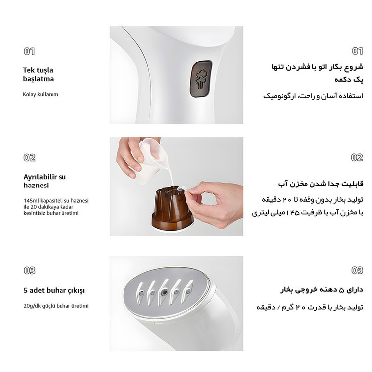 بخاردهی پیوسته و بُرس جمع آوری مو - بخار خودکار و دائما قدرتمند - ضد چکه، سیستم ایمنی خاموش شدن خودکار (ویژگی ایمنی مخصوص اتو بخار رُزکلین) - صفحه خروجی بخار از استیل ضد زنگ، نچسب و بدون ایجاد لکه - تولید بخار بدون وقفه تا 20 دقیقه با مخزن آب قابل جابجایی با ظرفیت 145 میلی لیتر - زمان گرم شدن سریع طی 20 ثانیه - قابلیت استفاده در دو حالت عمودی و افقی - طراحی ارگونومیک، شیک و جمع و جور برای نگهداری و حمل آسان - رفع چین و چروک آسان برای انواع پارچه ها و لباس ها - قدرت: 1000 وات - فوق العاده سبک جهت استفاده روزمره ( منزل، محل کار و مسافرت ) - قابلیت آهار دهی پرده و لباس حساس، دارای بُرس مخصوص جهت جذب گرد و غبار از سطح البسه و پارچه - ایمن برای انواع پوشاک - دارای چراغ ال ای دی نشانگر عملکرد دستگاه - مونتاژ ترکیه - دارای پیمانه مخصوص جهت اندازه گیری آب