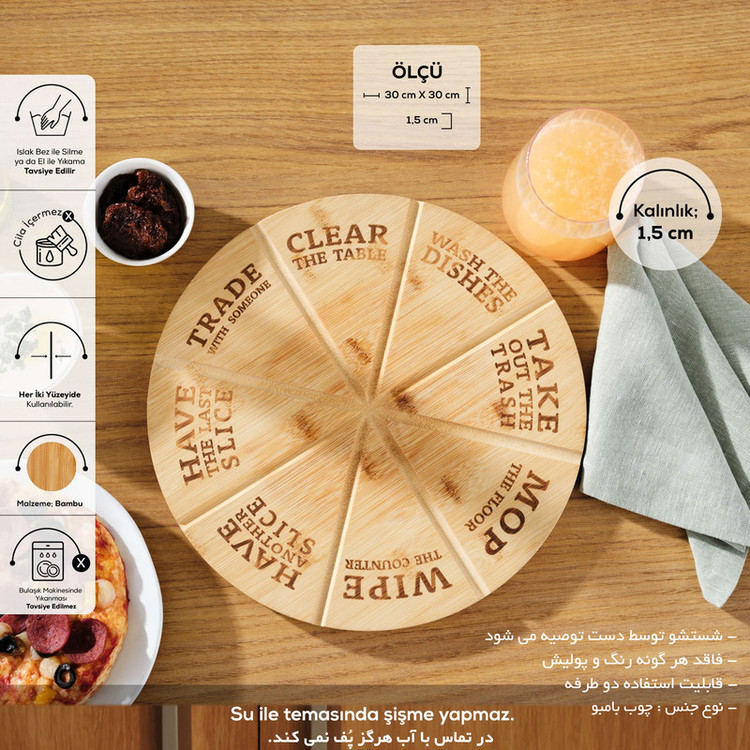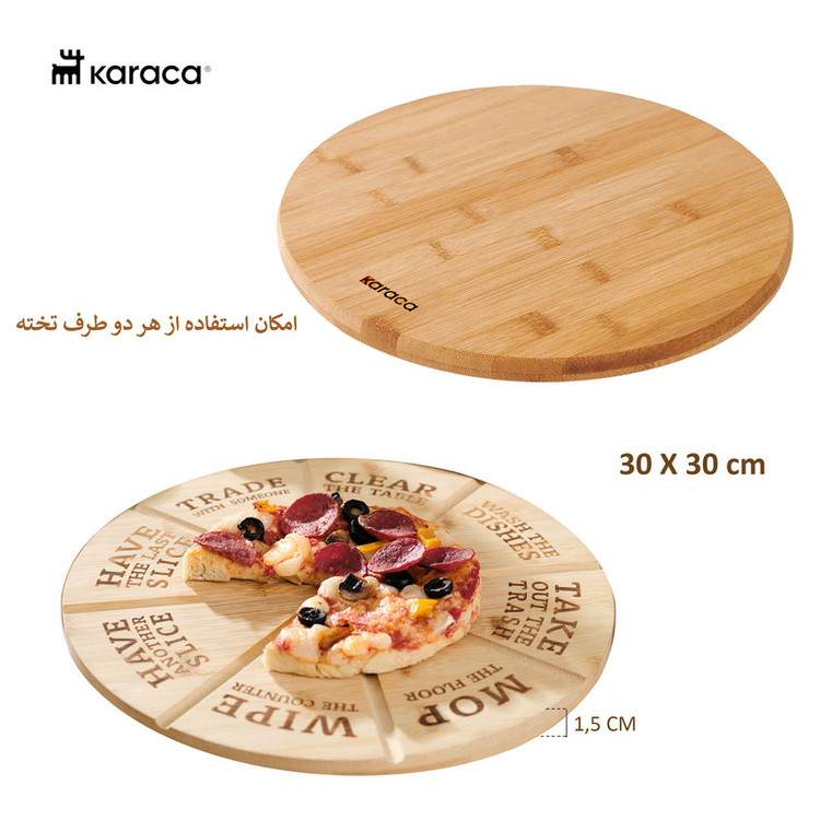 تخته سرو پیتزا ، محصولی جدید از کاراجا مدل فانی ( KARACA-FUNNY ) ساخت ترکیه با استانداردهای ایمنی سلامت، صنعتی و بهداشتی اروپا تولید و راهی بازارهای جهانی میشود. این تخته سرو ساخته شده از چوب بامبو با سطح برش در اندازه ایده آل و قابلیت استفاده از هر دو طرف تخته ، تجربه منحصر به فردی را در برش پیتزا و سرو آن ارائه می دهد. این واقعیت که می توان از هر دو سطح استفاده کرد، راحتی زیادی را برای شما ایجاد می کند. مناسب برای ارائه و استفاده به عنوان سینی، دیس پیتزا و غذا، این محصول به طور خاص طراحی شده است. این محصول سالهای سال می تواند زیر دست شما کار کند.