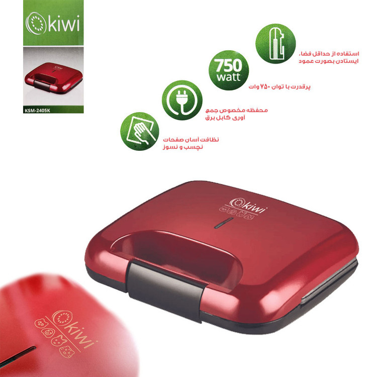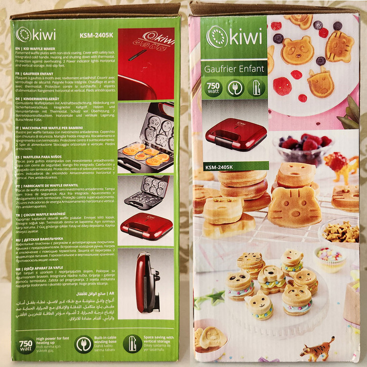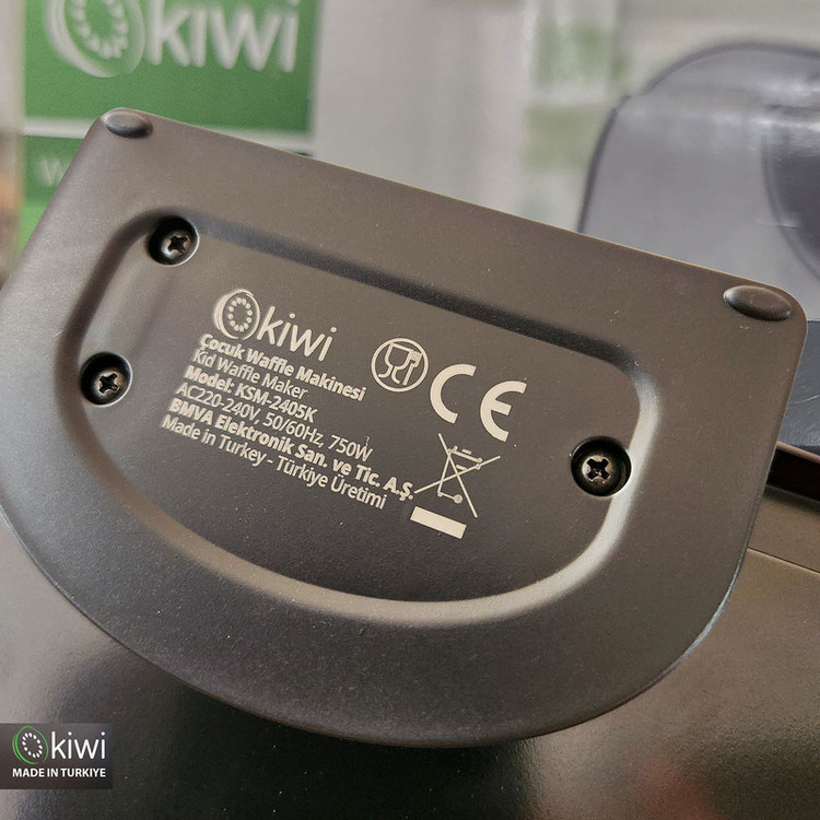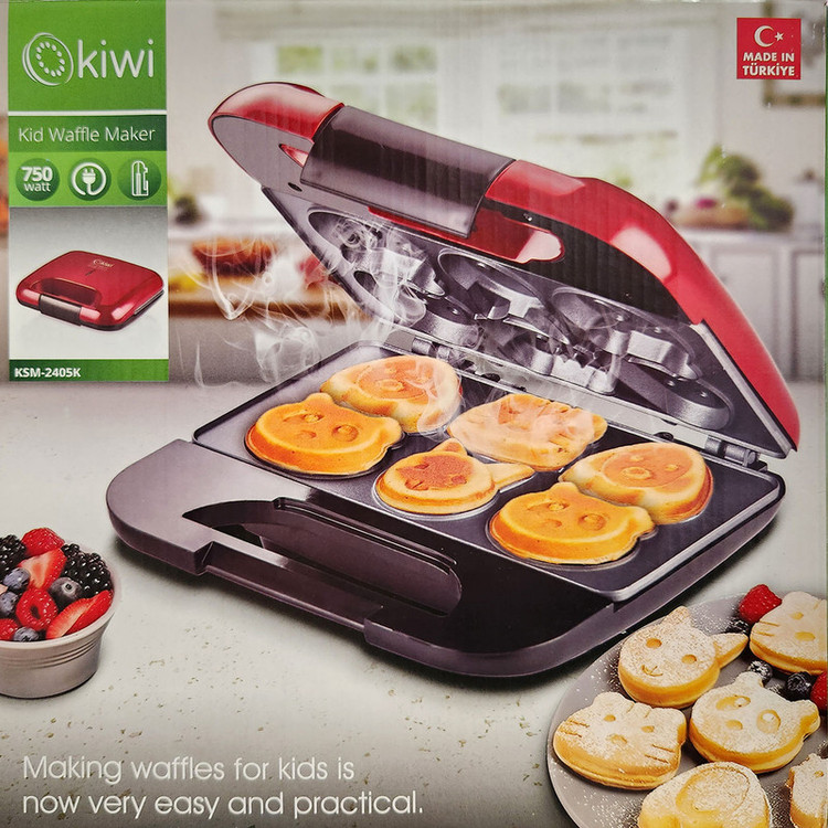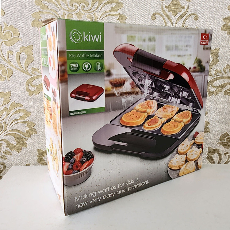 وافل ساز «کیوی» مدل 2405 KIDS ساخت ترکیه یکی از محصولات ساخت این شرکت است که یک محصول ساده و درعینحال بسیار کاربردی است. طرفداران این وافل ساز طرح کیدز، بچه ها هستند و مادر و پدرایی هستند که بچه هاشون میل و اشتهای زیادی به خوردن غذا و صبحانه نشون نمیدن، طرح های قالب این وافل ساز به شکل حیوانات طراحی و تولید شده است که بین کودکان بسیار جذاب و دلپسند می باشد. دارای صفحات نسوز و نچسب هست و از موتور قدرتمند 750 وات بهره میبرد. وافل ساز کیوی با طراحی ظاهری لوکس دارای پایه های سیلیکونی است که باعث عدم لرزش دستگاه میشود و از سطح میز فاصله میدهد. همچنین دستگیرهای که برای این ساندویچساز در نظر گرفته شده است بصورت اتومات باز و بست می شود و بصورت قفل ایمنی نیز عمل می کند و امکان جابهجایی راحت آن را فراهم کرده است. این مدل قابلیت قرارگیری بهصورت عمودی را نیز دارد و این ویژگی برای نگهداری آن در قفسه یا کابینت بدون اشغال فضای زیاد بسیار کاربردی است. از دیگر خصوصیات این محصول میتوان به سیستم قطع کن خودکار و نشانگر دو LED روی بدنه که در دوحالت گرم شدن صفحات ( آماده ریختن مواد) و حالت پخته شدن غذا اشاره کرد. محفظه مخصوص جمع آوری کابل را نیز دارد.