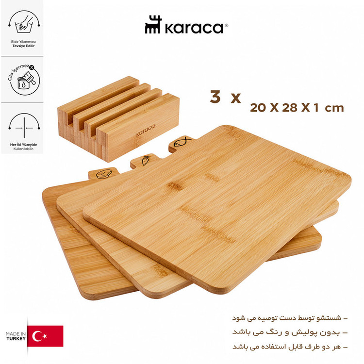 تخته گوشت، برش و خردکن کاراجا - ساخت ترکیه - مجموعه 4 پارچه - سطح برش دو طرفه - هر دو سطح تخته قابل استفاده می باشد - استفاده به عنوان سرو انواع غذا و خوراکی - قابل استفاده برای انواع نان، سبزی، میوه، ماهی و گوشت - استند مخصوص جهت نگهداری تخته ها - شستشو توسط دست توصیه شده است - بدون پولیش و رنگ می باشد - اندازه هر سه تخته : 20x28x1 سانتیمتر - دارای خاصیت ضد باکتری - مقاوم در برابر آب