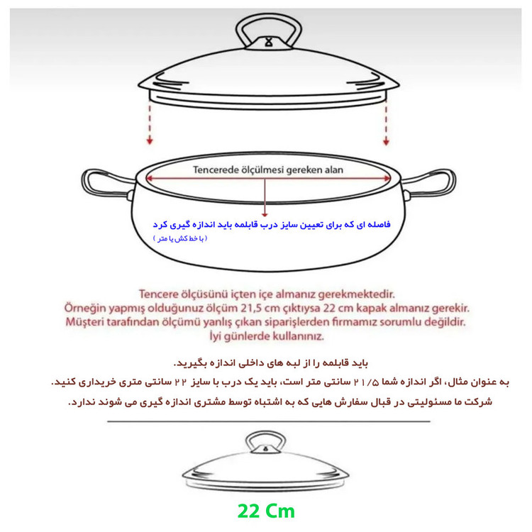 - سایز ۲۲ سانتی متر - ساخت ترکیه - قابل استفاده برای انواع قابلمه و تابه - جنس محصول از پیرکس اصل - مقاوم در برابر شوک های حرارتی بالا - وجود قسمت های مخصوص در قسمت لبه، جهت تخلیه بخار اضافی داخل قابلمه یا تابه - برای اطمینان از اندازه دقیق درب قابلمه یا تابه، از راهنمای تصویری قرار داده شده در تصاویر استفاده کنید - این محصول فقط یک عدد درب می باشد ( طبق تصویر اصلی محصول ) و هیچگونه دستگیره، دسته و .... همراه محصول ارسال نمی شود... - فاقد مواد سرطان زا