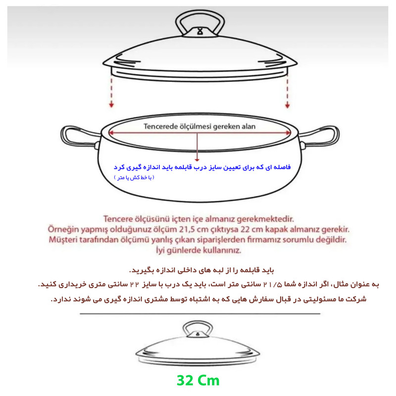 سایز ۳۲ سانتی متر - ساخت ترکیه - قابل استفاده برای انواع قابلمه و تابه - جنس محصول از پیرکس اصل - مقاوم در برابر شوک های حرارتی بالا - وجود قسمت های مخصوص در قسمت لبه، جهت تخلیه بخار اضافی داخل قابلمه یا تابه - برای اطمینان از اندازه دقیق درب قابلمه یا تابه، از راهنمای تصویری قرار داده شده در تصاویر استفاده کنید - این محصول فقط یک عدد درب می باشد ( طبق تصویر اصلی محصول ) و هیچگونه دستگیره، دسته و .... همراه محصول ارسال نمی شود... - فاقد مواد سرطان زا