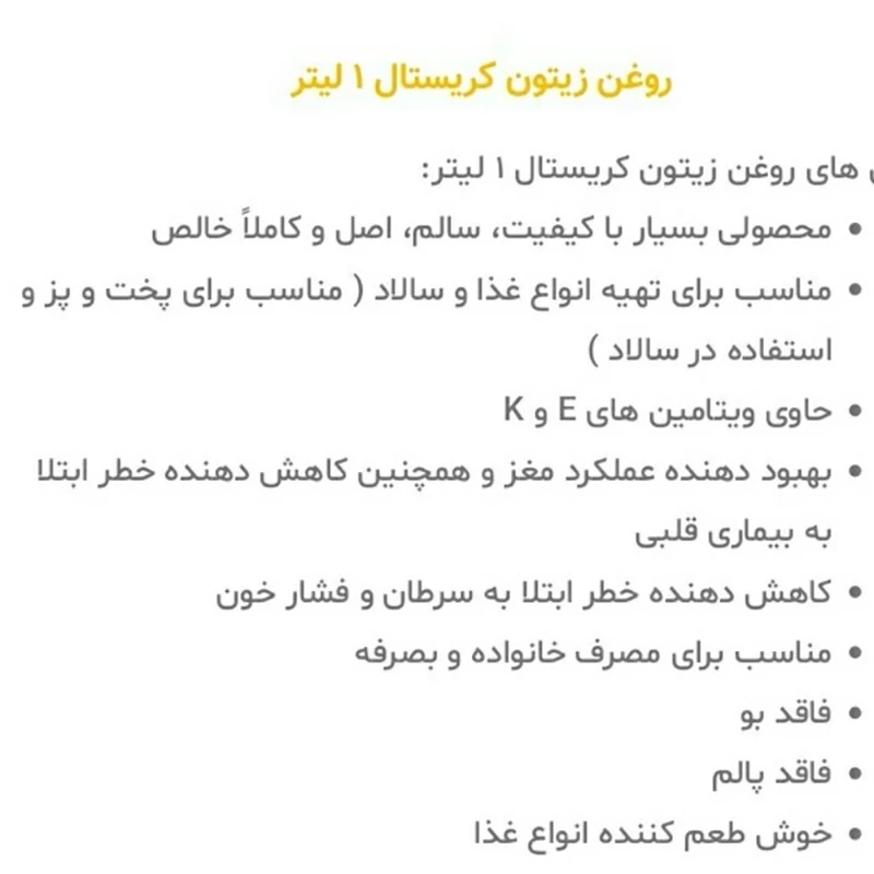 کریستال یکی از بهترین و معروف ترین برندهای روغن زیتون در دنیاست. روغن زیتون کریستال دارای ویژگیهای خاصی مانند خوش عطر بودن، ارزش غذایی بالا و همچنین حفظ خصوصیات طبیعی خود در زمان پخت میباشد و برخلاف سایر روغنهای گیاهی مستقیماً قابل مصرف است و خواص طبیعی خود را حفظ میکند. روغن زیتون کریستال حاوی روغن های طبیعی و تصفیه شده زیتون است که کشور ترکیه آنرا عرضه می کند. روغن زیتون را می توان در همه غذاهای سرد و گرم و تهیه کیک و شیرینی، طبخ انواع غذاهای لذیذ ، مزه دار کردن گوشت برای پخت کباب و در تهیه سالادهای مختلف مورد استفاده قرار داد. روغن زیتون کریستال با طعم خاص خود از بهترین زیتون ها و با فناوری های روز دنیا بدست آمده است. روغن زیتون سرشار از آنتی اکسیدان ها ، امگا 6 و امگا 3 هستند و اسید چرب آزاد آن از نظر اسید اولئیک بیش از 1 در صد نیست بنابراین استفاده از آن با توجه به فواید و مزایای زیادش بسیار توصیه میشود. تاثیرات درمانی روغن زیتون: کاهش ابتلا به بیماری های قلبی عروقی کاهش تشکیل ترکیبات شیمیایی مضر در هنگام پخت غذا وحفظ ارزش غذایی مواد خوراکی کاهش ابتلا به چاقی کاهش ابتلا به سرطان تنظیم قند خون بدن 🌟 ویژگیهای برجسته محصول: 1. ✅ تولید شده از زیتونهای تازه مناطق مدیترانه و اژه ترکیه 2. ✅ پرس سرد برای حفظ خواص طبیعی و طعم اصیل 3. ✅ سرشار از آنتیاکسیدانها، اسیدهای چرب مفید و ویتامین E 4. ✅ طعم و عطر ملایم و طبیعی – مناسب برای انواع غذاها 5. ✅ 100٪ طبیعی و خالص – بدون افزودنی یا مواد شیمیایی