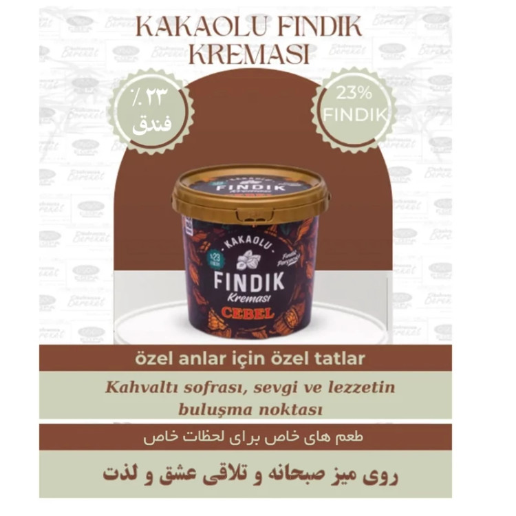 این محصول تولید کشور ترکیه است که با تولید شکلات صبحانه ایده آل ..همراهی خوب برای سفره های صبحانه و عصرانه شده است. این محصول دارای 23% فندق و درجه کیفی بالایی است. فاقد مواد افزودنی و حاوی مواد نگهدارنده و رنگ کننده نیست. چربی ترانس وجود ندارد. حاوی روغن پالم نیست. در جای خنک، خشک و بدون بو و در دمای اتاق نگهداری شود. از نور خورشید محافظت کنید. در یخچال نگهداری نکنید. وزن : 900 گرم بسیار خوشمزه و لذیذ با ترکیب23٪ کرم فندق و تکه های فندق و بدون روغن ترانس این محصول مناسب برای تمام گروه های سنی می باشد و در ظروف زیبایی بسته بندی می شود. وزن 900گرمی این محصول سبب می شود تا بتوانید در وعده های بیشتری از آن استفاده نمایید، اگر در طول روز می خواهید ورزش کنید یا رژیم بگیرید نیاز دارید تا انرژی به بدن تان برسانید. این محصول انرژی مورد نیاز روز را به شما می رساند تا در طول روز همانند یک بمب انرژی باشید و بتوانید به بهترین نحو فعالیت های روزمره خود را رسیدگی کنید و نیاز به نوشیدن چندین فنجان قهوه یا نوشابه انرژی زا نداشته باشید. شکلات صبحانه ی جبل یک ترکیب دل نشین از فندق و کاکائو می باشد که لذتی شگرف را برایتان به ارمغان می آورد.