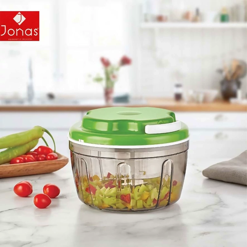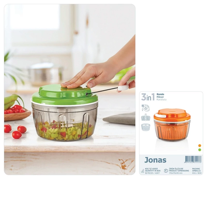 خشک کن، میکسر (مخلوط کن) و خردکن ژُناس ساخت فرانسه با طناب بزرگ؛ این محصول سه کاره ما راحتی زیادی در آشپزخانه برای شما فراهم می کند. به لطف تیغه های تیز و اتصال مخلوط کن، پیاز، سیر، هویج ، سبزیجات و میوه ها را عملا خرد کرده و مخلوط می کند. با دستگاه خشک کن به سرعت می توانید سالاد درست کنید. کاسه شفاف و سالم آن از مواد پلاستیکی محکم ( بدون BPA ، فاقد مواد مضر سلامتی انسان )ساخته شده است و به راحتی می توانید مواد داغ را با هم مخلوط کنید.دارای تیغه های فولادی ( استیل ) ضد زنگ با ماندگاری طولانی. این محصول کارآمد دارای استانداردهای ایمنی و سلامت انسان از اروپا می باشد.کار با این دستگاه بسیار راحت و جذاب بوده و کارایی عالی دارد. از این رو نیاز واقعی هر آشپزخانه و آشپز خوش سلیقه ای می باشد.برش حرفه ای و راحت با مکانیزم دستی به لطف تیغه سه گانه ضد زنگ. سطح دستی ارگونومیک و راحت. کاسه بادوام... این محصول از پلاستیک درجه یک مقاوم با استانداردهای بهداشتی و صنعتی اروپایی تولید شده و فاقد ماده شیمیایی بی پی ای که مضر سلامتی انسان است می باشد. این محصول جدید طراحی منحصر بفرد خود را دارد و شاسی موجود در روی درب محصول بسیار نرم و روان بوده که تنها با فشار دادن چند بار آن، کلیه مواد بصورت یکدست و یکنواخت خرد می شوند. بسیار ارگونومیک و خوش دست می باشد. این خرد کن دارای سه تیغه از استیل درجه یک بسیار تیز است و حتی با پرکردن کاسه از سبزیجات، مواد غذایی و... کند نمیشود و میتواند سالهای سال با کیفیت اولیه برای شما کار کند. نکتهی مهم دیگر این است که چون تیغه ها قوص دار می باشند و این باعث میشود مواد درون محفظه خردکن با چند بار کشیدن شاسی، بصورت یکدست و یکنواخت خرد شوند. از این محصول برای خرد کردن انواع مواد غذایی، میوه، سبزی، خشکبار، آجیل و ... می توان استفاده کرد. جنس محفظه خردکن از پلاستیک شفاف و پایه محصول از گسکت واشر سیلیکونی تولید شده که باعث چسبندگی آن به سطح میز شده و هرگز سُر نمیخورد. این محصول مورد نیاز هر کدبانوی خوش سلیقه ای می باشد. کلیه قسمت ها قابل شستشو در ماشین ظرفشویی هستند.