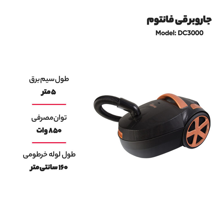 - جاروبرقی خوابیده فانتوم - ساخت ترکیه - توان موتور ۸۵۰ وات واقعی با توان مکش فوق العاده بالا - دارای سری های پارویی، سری گوشه کنار و لبه ها و سری مخصوص مبل، لحاف، تشک و... - طول لوله خرطومی ۱۶۰ سانتیمتر - طول کابل برق ۵ متر - ظرفیت کیسه گردوغبار ۵ لیتر - نشانگر مخصوص پرشدن کیسه گردوغبار - سیم جمع کن خودکار - حالت پارک جاروبرقی : بصورت خوابیده - دارای فیلتراسیون ۳ مرحله ای - بافت کیسه طوری طراحی شده که گردوغبار موقع جارو کردن را به بیرون انتقال نمی دهد.