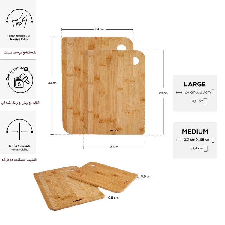 تخته برش 2 عددی کاراجا مدل آزور ( KARACA-AZUR ) ساخت ترکیه با استانداردهای ایمنی سلامت، صنعتی و بهداشتی اروپا تولید و راهی بازارهای جهانی میشود. این تخته برش با مزیت دو عددی بودن و سطح برش در اندازه ایده آل تجربه منحصر به فردی را در برش غذا و تهیه غذا ارائه می دهد. این واقعیت که می توان از هر دو سطح استفاده کرد، راحتی زیادی در آشپزخانه شما ایجاد می کند. پس از اتمام کار با آویز ترکیبی، می توانید آن را آویزان کنید. مناسب برای ارائه و استفاده به عنوان سینی، دیس و غذا، این محصول به طور خاص طراحی شده است. تخته برش، تخته خردکن یا تخته گوشت کاراجا مدل آزور که مورد نیاز هر آشپزخانه و کدبانوی خوش سلیقه می باشد. این محصول سالهای سال می تواند زیر دست شما کار کند. جهت انواع نان، سبزی، میوه، ماهی و گوشت طراحی شده است....- مقاوم در برابر آب