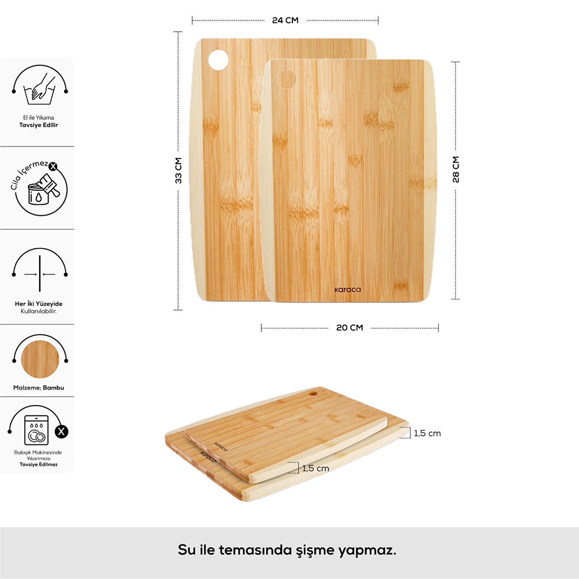 - تخته گوشت، برش و خردکن کاراجا - ساخت ترکیه - مجموعه 2 عددی- سطح برش دو طرفه - هر دو سطح تخته قابل استفاده می باشد - استفاده به عنوان سرو انواع غذا و خوراکی - قابل استفاده برای انواع نان، سبزی، میوه، ماهی و گوشت - دسته جهت آویز کردن آسان - شستشو توسط دست توصیه شده است - بدون پولیش و رنگ می باشد - دارای خاصیت ضد باکتری - مقاوم در برابر آب