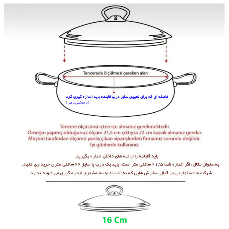 - سایز ۱۶ سانتی متر - ساخت ترکیه - قابل استفاده برای انواع قابلمه و تابه - جنس محصول از پیرکس اصل - مقاوم در برابر شوک های حرارتی بالا - وجود قسمت های مخصوص در قسمت لبه، جهت تخلیه بخار اضافی داخل قابلمه یا تابه - برای اطمینان از اندازه دقیق درب قابلمه یا تابه، از راهنمای تصویری قرار داده شده در تصاویر استفاده کنید - این محصول فقط یک عدد درب می باشد ( طبق تصویر اصلی محصول ) و هیچگونه دستگیره، دسته و .... همراه محصول ارسال نمی شود... - فاقد مواد سرطان زا