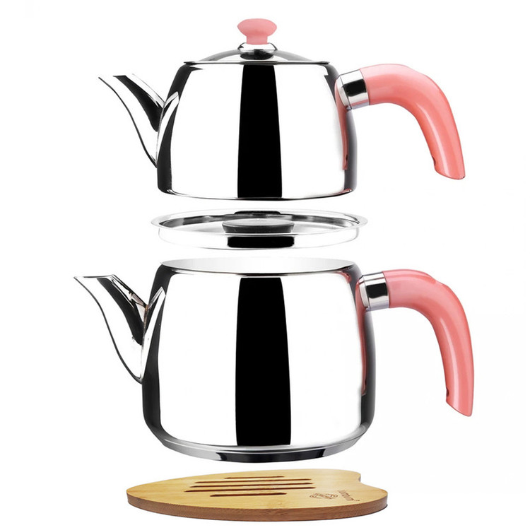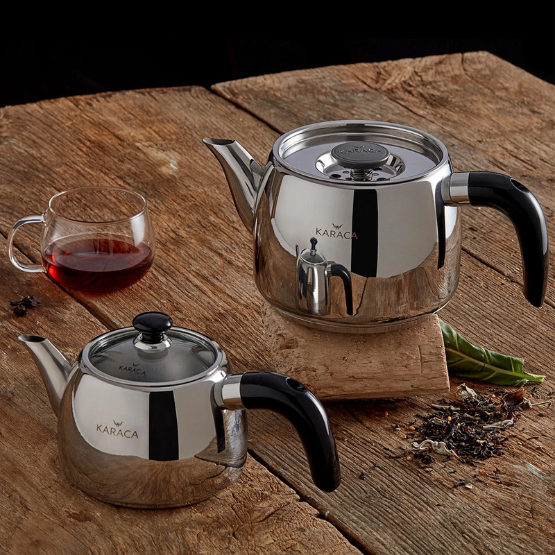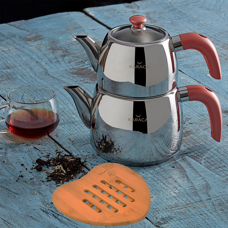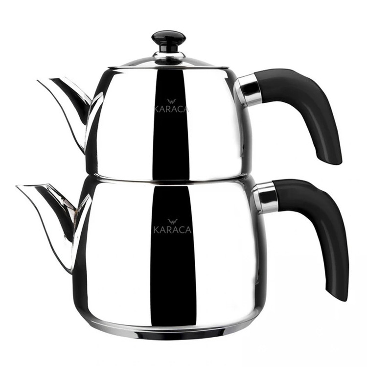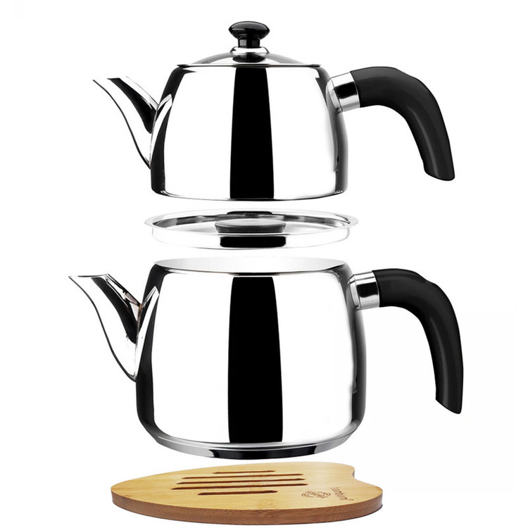 مجموعه ست کتری، قوری و پایه چوبی بامبو مدل گالیا محصولی جدید از کمپانی بزرگ کاراجا ترکیه می باشد، این محصول متفاوت از نظر طراحی و زیبایی نسبت به دیگر محصولات موجود در بازار که در ایده ای جدید همراه با پایه چوبی بامبو روانه بازارهای جهانی شده است، توانسته در مدت بسیار اندکی مشتریان زیادی از ترکیه و اروپا جذب خود نماید، کتری قوری گالیا باکیفیت و زیبا از استیل ضدزنگ نیکل - با روکش کروم 18/10 مرغوب ترین نوع استیل میباشد که از نظر دوام و کیفیت استیل بی نظیر بوده و مادام العمر کیفیت خود را حفظ می نماید. دسته های این محصول شیک و بینظیر از جنس باکالیت که کاملا عایق نچسب و نسوز می باشند تولید شده است. با این محصول دیگران نگران استفاده از کتری و قوری داغ روی سفره، پلاستیک و چیزهایی که گرما به آن آسیب می رساند نباشید، چون پایه چوبی قرار داده شده روی این محصول این مشکلات را برطرف نموده است. کتری این مجموعه دارای درب ایمنی مخصوص می باشد که با برش هایی به منظور تخلیه بخار طراحی شده است که هنگام برداشتن قوری فنر امنیت موجود روی درب از بخار داغی که ممکن است دست و صورت را لمس کند جلوگیری می کند، وقتی قوری دوباره سر جای خود قرار گرفت ، تخلیه بخار به طور خودکار شروع می شود و اطمینان حاصل کنید که چای شما با طعم دلخواه دم می شود. پوشش بخار باعث کاهش 90 درصدی مصرف انرژی می شود و اطمینان حاصل می کند که هم آب کتری شما و هم چای قوری داغ است. به لطف صافی های موجود در قوری و کتری ، می توانید چای های خوشمزه را در مدت زمان بسیار کمتری بدون نیاز به صافی اضافی دم کنید. این کتری و قوری لاکچری برای استفاده روی کلیه اجاق های موجود در بازار مناسب می باشد. کتری 2.1 لیتر و قوری 1.2 لیتر ظرفیت را دارا هستند که در نوع خود عالی می باشند.