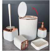 جدیدترین ست سرویس بهداشتی 5 پارچه طرح الماس ساخت فری هوم ترکیه پیشرو در صنعت بهداشت و لوازم خانگی، این ست 5 پارچه تمام نیازهای موجود در حمام و سرویس های بهداشتی را برطرف می نماید، محصولی بسیار کاربردی به همراه کیفیت و زیبایی. این مجموعه زیبا از آکریلیک تولید شده است که ماندگاری بسیار بالایی دارد. دارای استانداردهای ایمنی و سلامت بهداشت انسان از اروپا را دارد و محصولی صادراتی به اروپا می باشد. شامل سطل درب دار، فرچه و ظرف مخصوص آن، جا مسواکی، جامایع پمپی و جاصابونی می باشد.تمامی اقلام قابلیت شستوشو دارند و میتوانید با خیالی آسوده، آنها را بشویید. با این ست بهداشتی مدل الماس زیبایی محیط و سرویس ها چندین برابر میشود.