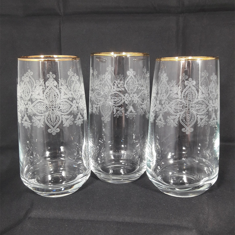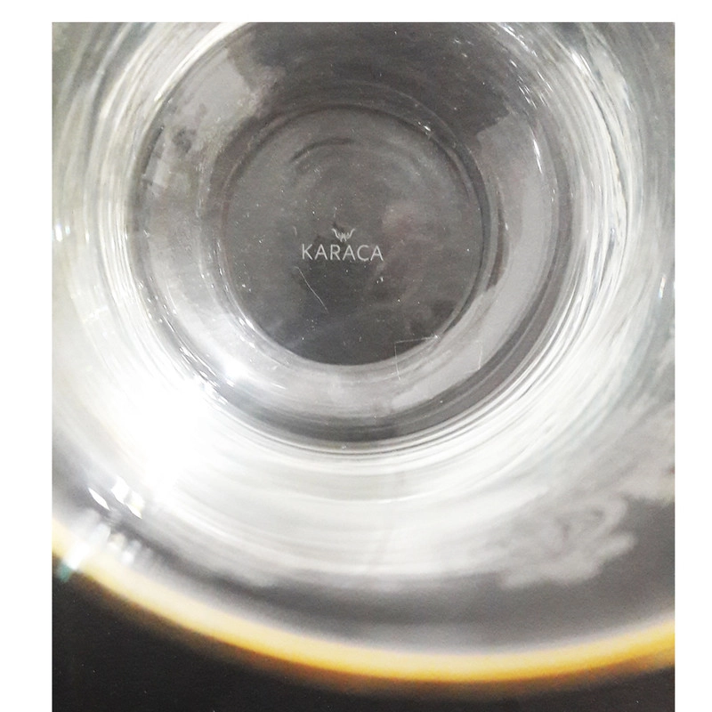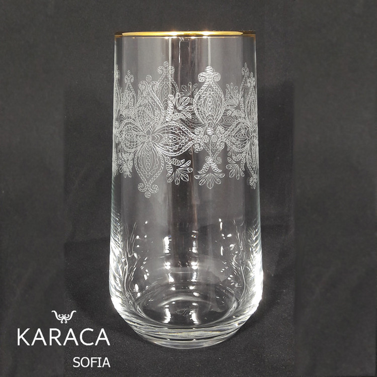 ساخت برند معتبر کاراجا ترکیه دارای لبه های طلاکوب ارتفاع لیوان 15 سانتی متر طرح نیم برجسته گل و ساقه روی لیوان شفافیت بالا و جنس مقاوم شستشو با دست